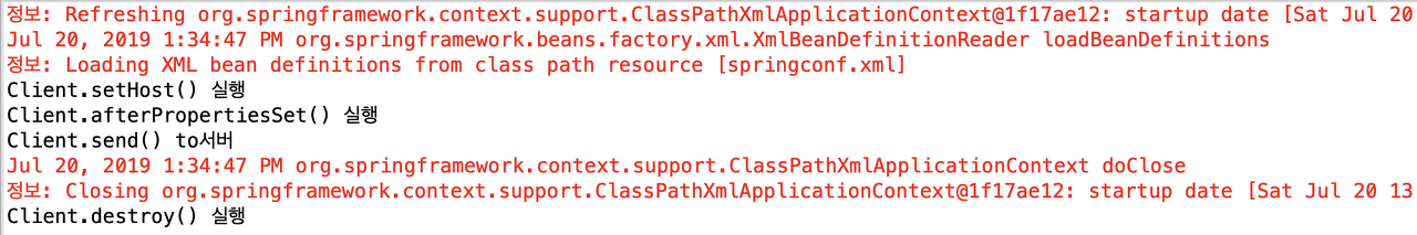 위의 코드는 스프링 인터페이스를 이용한 초기화 / 소멸 메서드가 실행되는 걸 확인하는 예제입니다.