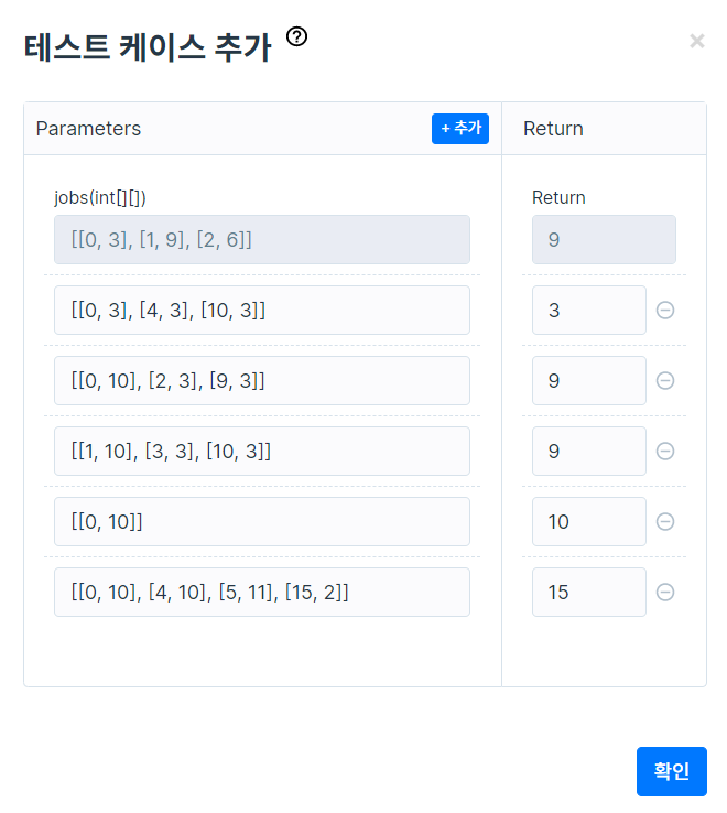 각 작업에 대해 [작업이 요청되는 시점, 작업의 소요시간]을 담은 2차원 배열 jobs가 매개변수로 주어질 때, 작업의 요청부터 종료까지 걸린 시간의 평균을 가장 줄이는 방법으로 처리하면 평균이 얼마가 되는지 return 하도록 solution 함수를 작성해주세요. (단, 소수점 이하의 수는 버립니다)
